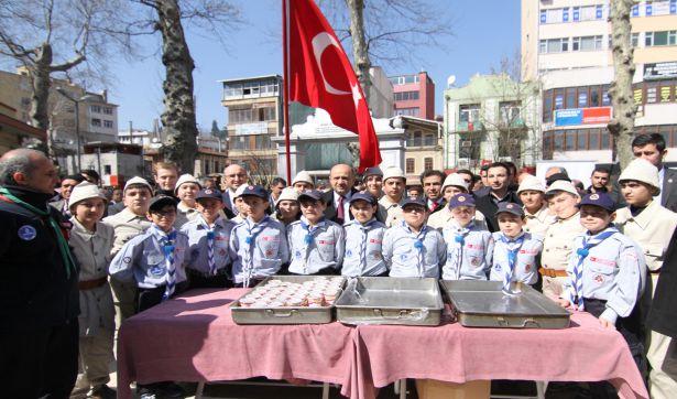 İzcilerimiz, Çanakkale Savaşında askerlerin yaşadığı zorlukları hatırlatmak için askerlerin yemek menüsünde yer alan üzüm hoşafı dağıttı.