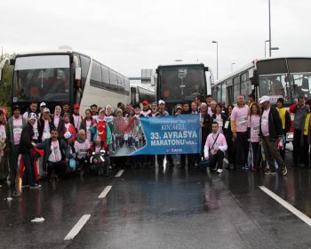 Bu yıl 33’ncisi düzenlenen Avrasya Maratonu yine çok renkli görüntülere sahne oldu. Maraton’da Boğaz Köprüsü’nden yürüyerek geçen Kocaeliler Dünya Sağlık Örgütünün meme kanseriyle mücadele kampanyasına dikkat çekmek için pembe tişört giydiler. Yılda bir kez boğaz köprüsünde yürüyerek geçme fırsatını değerlendirmek isteyen Kocaeliler soğuk havaya rağmen hem eğlendiler hem de boğazın eşsiz güzelliğinde ölümsüz kareler yakaladılar.